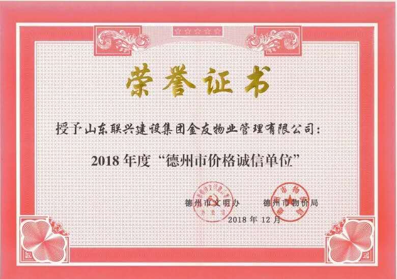 本报讯(记者 王庆利)近日,2018年度德州市价格诚信单位名单公布,山东联兴建设集团金友物业管理有限公司与全市其他21家单位获此殊荣。